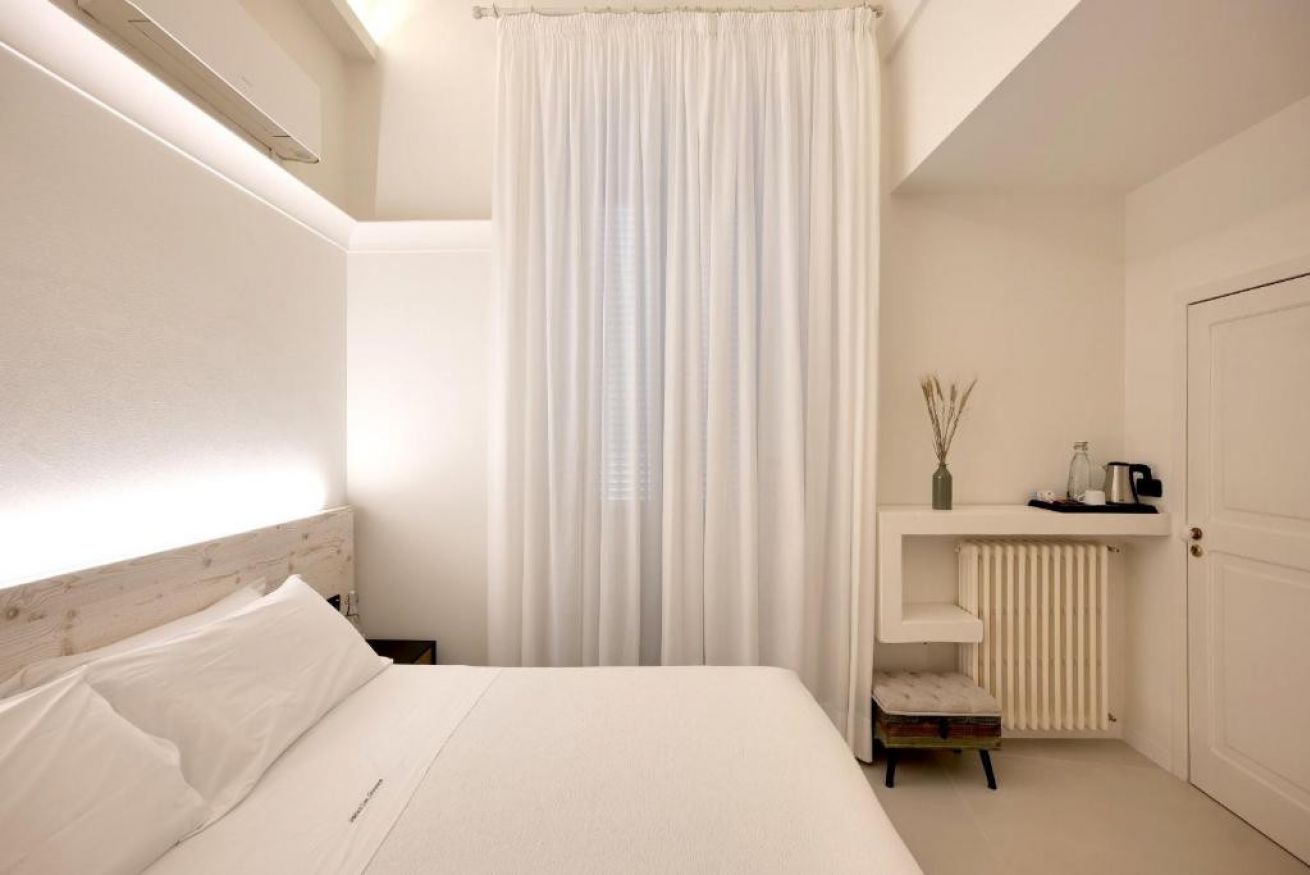 La camera è munita di un balconcino con affaccio fronte strada esattamente sulla via dei caffè e ristoranti tipici della città antica. Il bagno in camera con doccione è di grandi dimensioni ed è realizzato con pavimentazione in legno ceramica e tinte stonalizzate per valorizzare le splendide volte che caratterizzano gli ambienti.